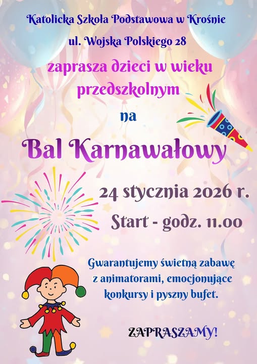 Serdecznie zapraszamy dzieci w wieku przedszkolnym i kandydatów do klasy I naszej szkoły na Bal Karnawałowy...