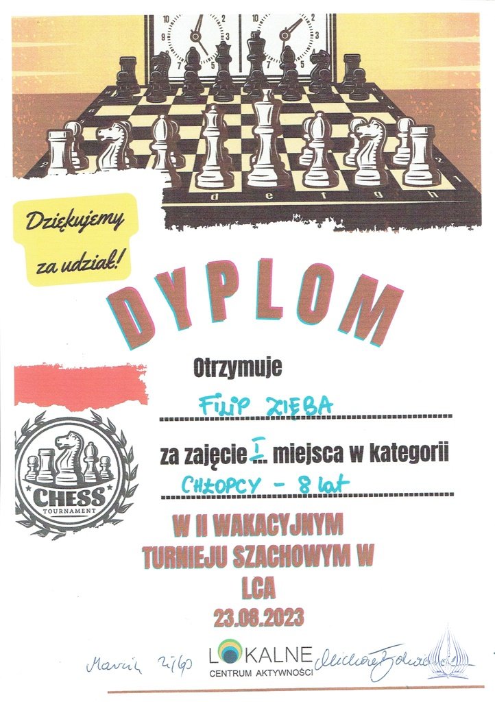Filip Zięba to uczeń klasy II Katolickiej Szkoły Podstawowej, którego wielką pasją jest gra w szachy. Jak na swój młody wiek ma już na koncie udział w wielu turniejach szachowych na różnych szczeblach. W rywalizacji zarówno w swojej grupie wiekowej, jak i starszej odnosi liczne sukcesy. Do najważniejszych z nich należą: